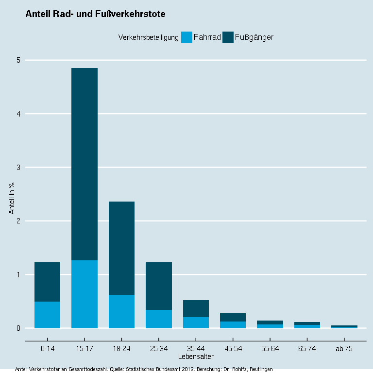Das Bild zeigt den Anteil der Rad- und Fussverkehrstoten an allen Todesfällen in der jeweiligen Altersgruppe.