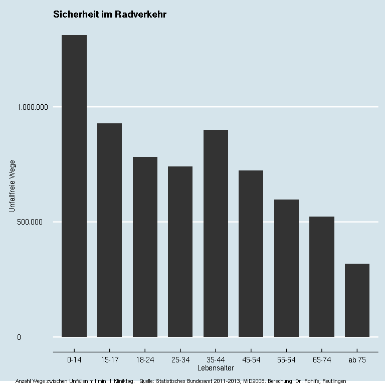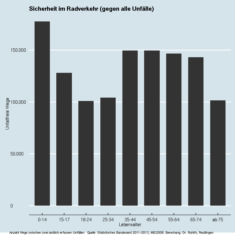 Verglichen mit den Wegen pro Lebensalter ergibt sich nebenstehendes Bild. Entgegen der üblichen Darstellung sind die jungen Menschen nicht besonders "gefährdet", sondern im Gegenteil besonders sicher unterwegs.